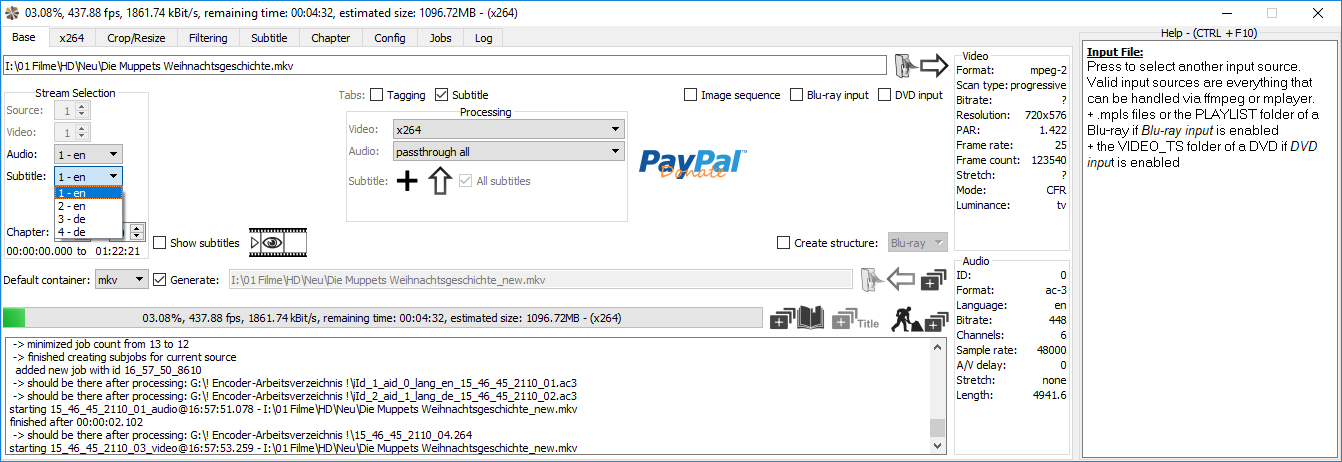 Cu Selur RE: Ich verliere Untertitel - Urvieh - 22.12.2018 Danke für die Mühe. Ich bin deiner Anleitung gefolgt, sehe dann aber ein durchweg ausgegrautes Programm, d. h., ich kann keinerlei Button mehr bemaustasten, also auch keine andere Datei auswählen, während im Protokoll als letzte Zeile steht: "Ignored and deleted '{Dateiname mit Pfad}_id_4_lang_de.idx' too small!" Selbstmordvariante? ![]() Warte, ich probiere mal etwas ... RE: Ich verliere Untertitel - Selur - 22.12.2018 Ohne DebugOutput oder wenigstens Details was Du machst: Keine Ahnung RE: Ich verliere Untertitel - Urvieh - 22.12.2018 So: 1. Ich war die Idiotin. Die Ausgangsdatei enthielt Untertitel nur "auf dem Papier", es wurde aber keine angezeigt. Insofern ist das Verhalten nachvollziehbar. Na ja, nicht ganz, ich komme gleich darauf zurück. 2. Mit einer untertitelten Datei klappt es jetzt. Danke. 3. Während der Kodierungsprozeß lief, habe ich die vorhergehende, "leere" Datei geladen. Das Ergebnis war wieder ein ausgegrautes Hybrid, aber die laufende Datei wurde bis zu Ende gerechnet. Ich schlage vor, hier etwas abzufangen, denn ich konnte nichts weiter tun, nicht einmal zum Jobs-Tab navigieren. Keine Chance. 4. Eine Frage: Beim x264 ist der Preset auf "None" gestellt. Welcher wird dann angewendet? Superfast? Zwischen "None" und "Medium", meiner persönlichen Präferenz, liegen Welten, was Geschwindigkeit und Dateigröße angehen. Danke im voraus für die Antworten. Ach ja: Schönes Wochenende und schöne Feiertage, quasi mal so vorsichtig jetzt schon gewünscht.