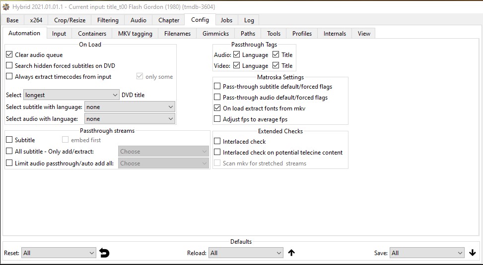Stretch detection? - incans - 09.01.2021 Hardware: Core i7-4770K, 16GB RAM OS: Windows 7 Pro 64bit Hybrid: 2020.12.13.1 (dev patch) My first attempt to rip and transcode a film made in Cinemascope (2.35:1 aspect ratio) was a major failure. While trying to work out how to deal with it I found this under the help in the section Base->Video->Stretch Quote:if 'Config->Automation->Matroska Settings->Scan for streched streams' is enabled 'Stretch' shows the detected stretch for the this stream Minor issue, there is an unecessary "the" in this text. Larger issue, on my system the option Scan mkv for stretched streams is disabled (greyed out)? I'm not even sure if "stretch" refers to the anamorphic projection (non 1:1 pixel aspect ratio) applied to this film, but if the option isn't available I can't test it to see. What determines whether the stretch analysis option is enabled? RE: Stretch detection? - Selur - 09.01.2021 Quote:Larger issue, on my system the option Scan mkv for stretched streams is disabled (greyed out)?Option is disabled since it doesn't work properly atm. Quote:I'm not even sure if "stretch" refers to the anamorphic projection (non 1:1 pixel aspect ratio) applied to this film, but if the option isn't available I can't test it to see.Stretch has nothing to do with the PAR of the input. Matroska has an option to stretch/shrink audio, read: https://gitlab.com/mbunkus/mkvtoolnix/-/wikis/Stretch-or-shrink-audio-tracks Quote:My first attempt to rip and transcode a film made in Cinemascope (2.35:1 aspect ratio) was a major failure.Since you didn't share in what way it was a failure, I can't really help. My wild guess would be that your input is Cinemascope (2.35:1 display aspect ratio), but isn't properly flagged. -> share details about your problem if you want help Cu Selur RE: Stretch detection? - incans - 12.01.2021 Quote:My first attempt to rip and transcode a film made in Cinemascope (2.35:1 aspect ratio) was a major failure.>> Since you didn't share in what way it was a failure, I can't really help. I wanted to try to make sense of it myself if I could ;-) >>My wild guess would be that your input is Cinemascope (2.35:1 display aspect ratio), but isn't properly flagged. Exactly so. This is what I found by experimenting with the (very useful) tools in Hybrid- The source was a DVD of Flash Gordon (1980). The original film is a Cinemascope 2.35:1 feature, and the DVD describes itself as 16:9 anamorphic. However the mkv rip shows up in Hybrid with an aspect ratio of 16:15 (1.067:1) which is clearly nonsense. Attempt 1 First pass I just treated this like a normal 16:9 film. I was rewarded with a picture occupying about 50% of the screen horizontally and 40% vertically. A little vertically squeezed sticking plaster of a picture. Attempt 2 For the next attempt I did the following-