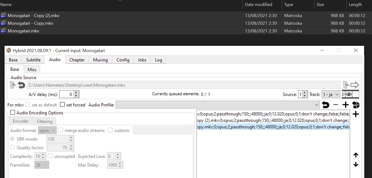 As can be seen with the filesizes, only the first job in the queue (Monogatari.mkv) removed did anything (Monogatari_new.mkv)