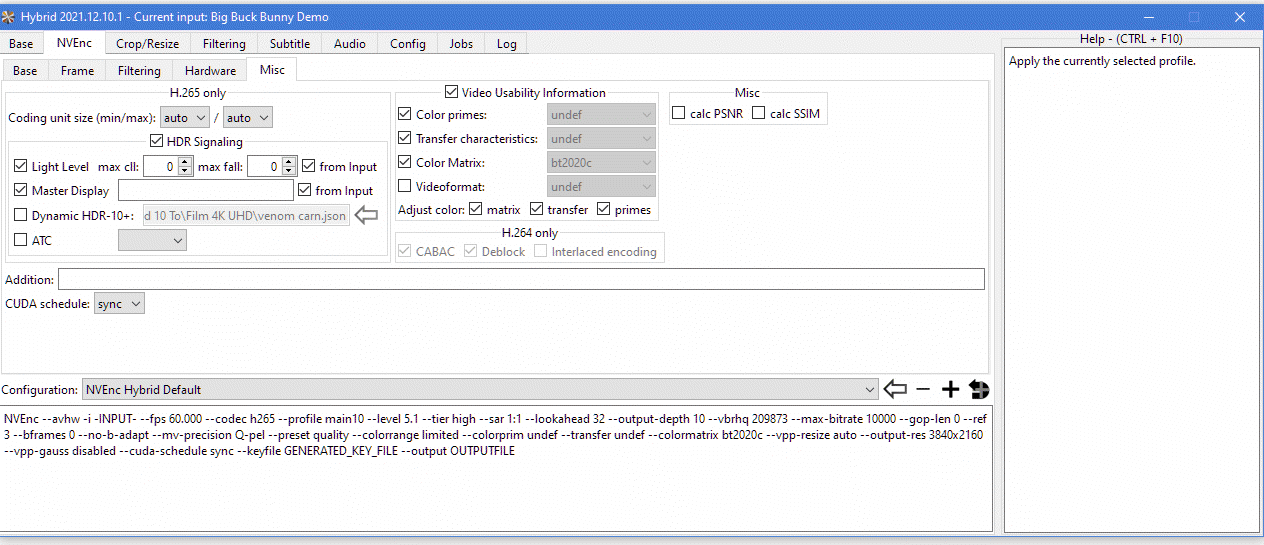 So Dan64, I'll ask my question again, is your RTX 3060 100% (video encoder in Windows task manager) while encoding? this is my bench to compare : That's what I thought, the bench is therefore useless and does not reflect my problem, I already know that my RTX is more powerful than the GTX in computing and in games. So it is not logical that the GTX encodes 2x faster than the RTX with the same parameters, do we agree? Selur rightly, we must compare with the same settings: I'm using a UHD HDR10 video (2160p) of 7.34 min, 4.38 GB, it is the first minutes of the film "The Protégé", but I can't upload to uptobox ... you can use a video of your choice which is of course equivalent. my command line: NVEnc --avhw -i -INPUT- --fps 23.976 --codec h265 --profile main10 --level 5.1 --tier high --sar 1:1 --lookahead 32 --output-depth 10 --vbrhq 19769 --max-bitrate 10000 --gop-len 0 --ref 3 --bframes 0 --no-b-adapt --mv-precision Q-pel --preset quality --colorrange limited --colorprim bt2020 --transfer smpte2084 --colormatrix bt2020c --max-cll 1000,923 --master-display G(13250,34500)B(7500,3000)R(34000,16000)WP(15635,16450)L(10000000,1) --vpp-resize auto --output-res 3840x2160 --vpp-gauss disabled --cuda-schedule sync --keyfile GENERATED_KEY_FILE --output "J:\Download 10 To\4K UHD enc\The.Prote test 4.265"