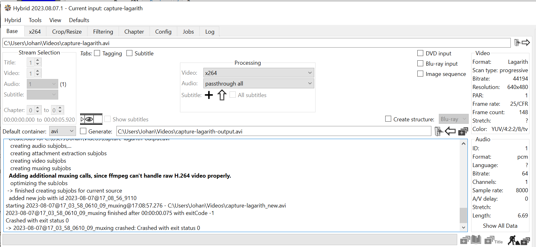=> will look into the FFmpeg command line to allow muxing H264 into .avi (even if it's not really what I would recommend)