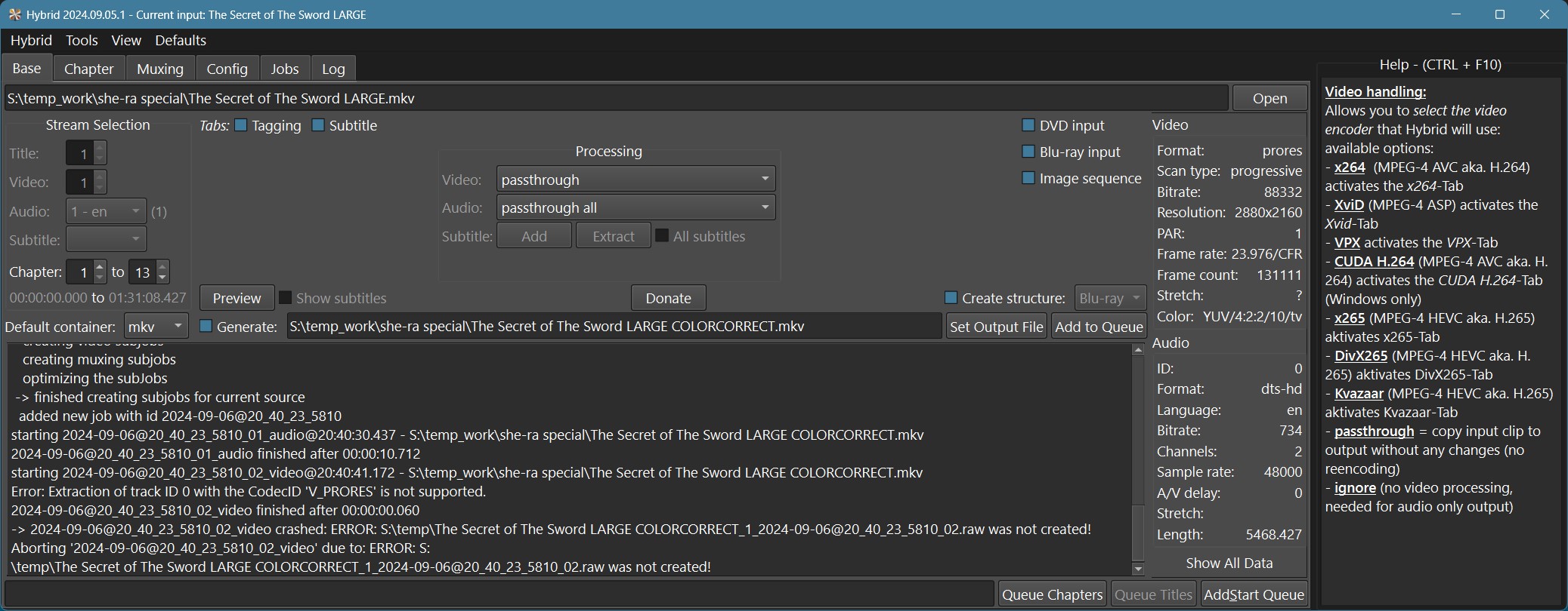 - Loading an .mkv with prores+dts inside (previously created by hybrid)