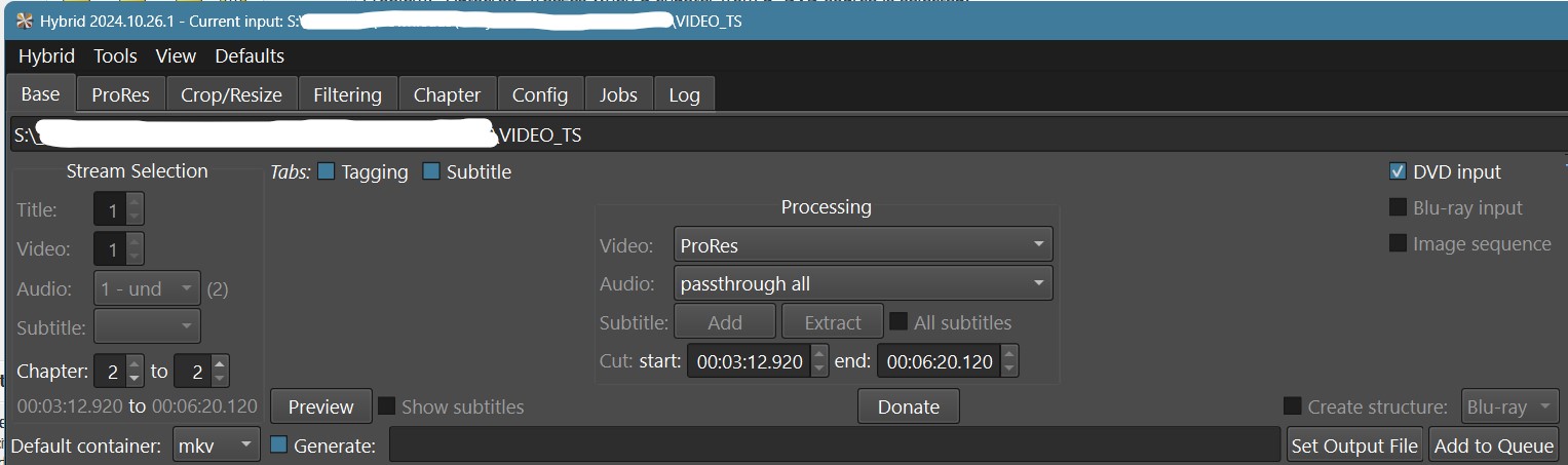 I tried the DVD input function today and the DVD was accepted in hybrid after I but clicked on the vdeo_TS files, it told me about 2 types of de-interlace, 1 the side panel with media info showed it as top field first but hybrid told me it was telecine 29.97 I think it asked me to use the telecine filter.