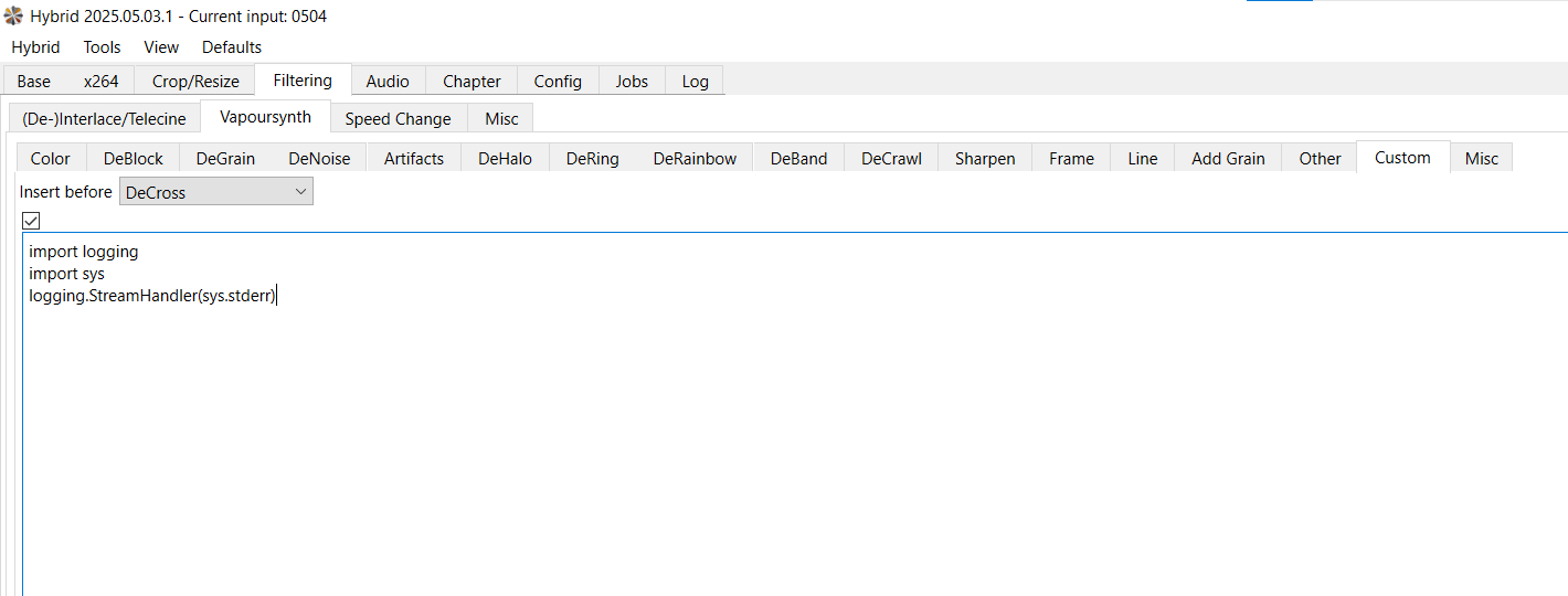 When using the Vapoursynth deinterlacer MFDIN with the TRT=True option, Hybrid crashes already at the vspipe stage without outputting a single frame, and the next line in the log shows the encoder error: