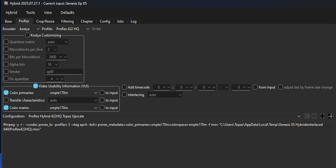ffmpeg -y -noautorotate -nostdin -threads 8  -color_primaries bt470bg -color_trc smpte170m -colorspace bt470bg -color_range tv -i "/Users/selur/Desktop/test.avi" -map 0:0 -an -sn -vf fps=59.94 -color_primaries bt470bg -color_trc smpte170m -colorspace bt470bg -color_range tv -pix_fmt yuv422p10le -strict -1 -r 60000/1001  -vcodec prores_ks -profile:v 0 -vtag apco -metadata encoding_tool="Hybrid 2025.10.06.1" -aspect 640:352 -f mov "/Users/selur/Output/test_1_2025-10-13@20_29_04_8010_01.mov"