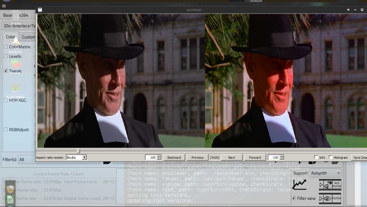Tweak gets applied to the right side only, conversion to RGB32 is done since the preview is always RGB and to make sure the right Matrix is used for that conversion this is done in the Avisynth script.