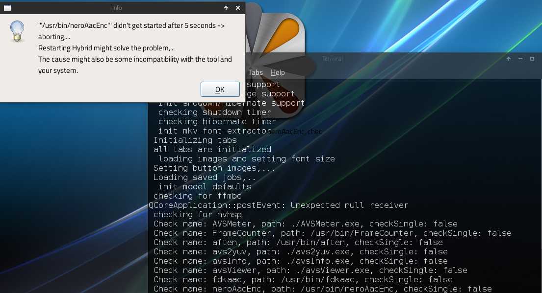 Regarding NeroAaacEnc: try whether you can call it from a console and see what it outputs. Hybrid looks at that output, but apparently the output is empty, which should not be the case when it works.