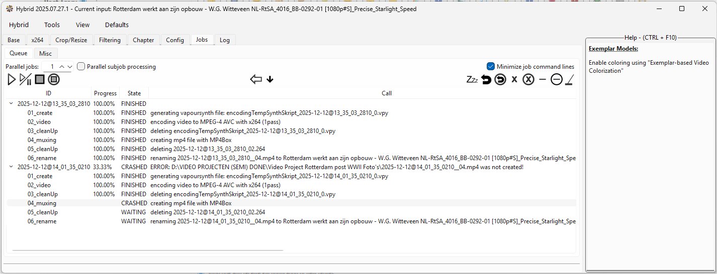 2. I have the same problem on two PC's. My question was whether it has to do with the Setup order: I first install Hybrid and then the Vapoursynth colorizer files. During the install of Vapoursynth colorizer there is the choice between overwriting already existing Hybrid files or not. I have a feeling that the crash is related to that?