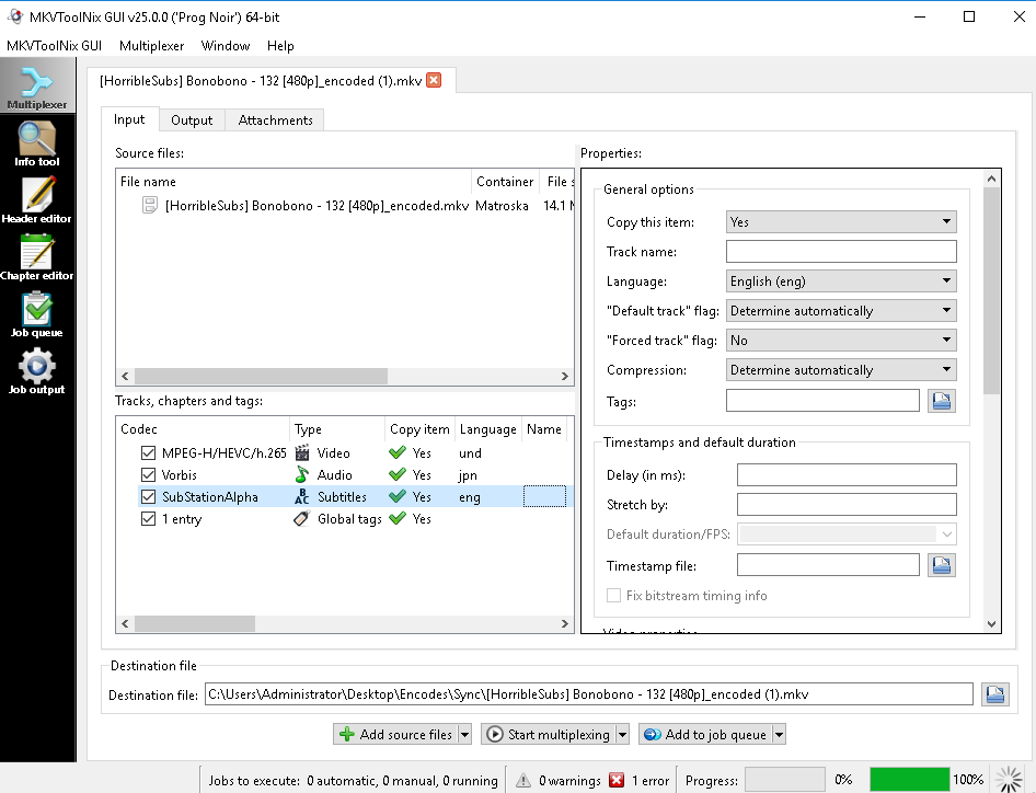 File 'C:\Users\Selur\Desktop\[HorribleSubs] Bonobono - 132 [480p] (1).mkv': container: Matroska